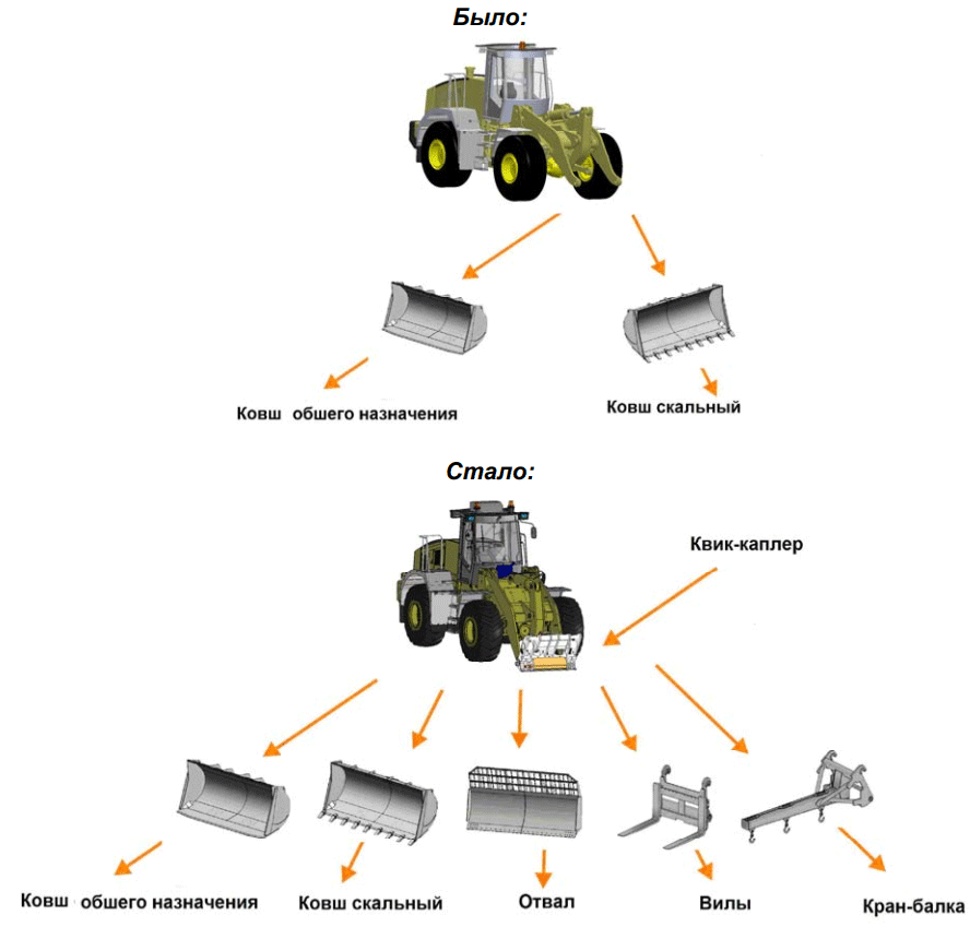Для упрощения смены рабочего оборудования в конструкции погрузчика предусмотрена возможность установки быстросъемного устройства - квик-каплера БКК-2-QF.
