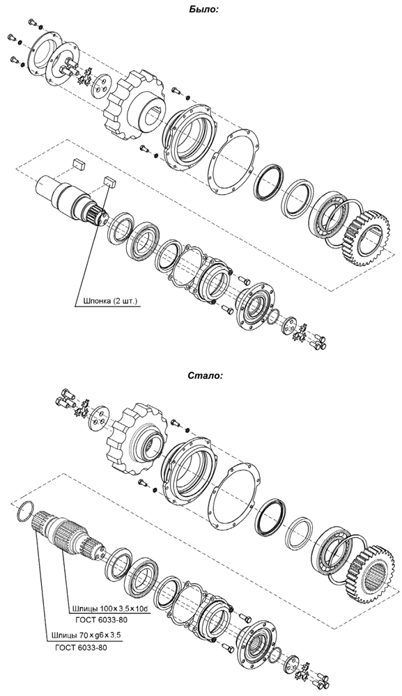 С целью улучшения центрирования соединяемых деталей, уменьшения количества деталей в узле, повышения надежности при динамических нагрузках и возможности передачи больших вращающихся моментов за счет большей поверхности контакта, шпоночное соединение заменено на шлицевое.