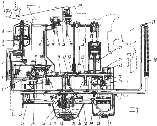 Отвернуть болты крепления картера к блоку дизеля, кожуху распределения шестерен и кожуху маховика, снять картер. Если картер невозможно снять полностью с дизеля, установленного на агрегате, снять только его переднюю часть. При этом следить, чтобы не была повреждена прокладка между блоком и картером. Снять передний маслоприемник 28 (см. рис. 15).