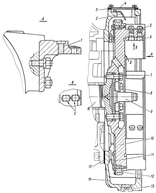 Для снятия кожуха 14 (см. рис. 61) маховика снимите дизель с трактора и маховик. Отверните четыре болта крепления картера к кожуху маховика и семь гаек крепления кожуха маховика к блоку дизеля.