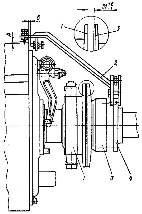 • выставьте болтами размеры А и В в верхней точке маховика 1,0 ... 1,5 мм, сделайте метку и, поворачивая маховик и фланец с приспособлением, замерьте размеры А и В в последующих трех положениях через каждые 90°. Разность замеров в четырех точках размера А допускается не более 0,6 мм, размера В не более 0,7 мм;