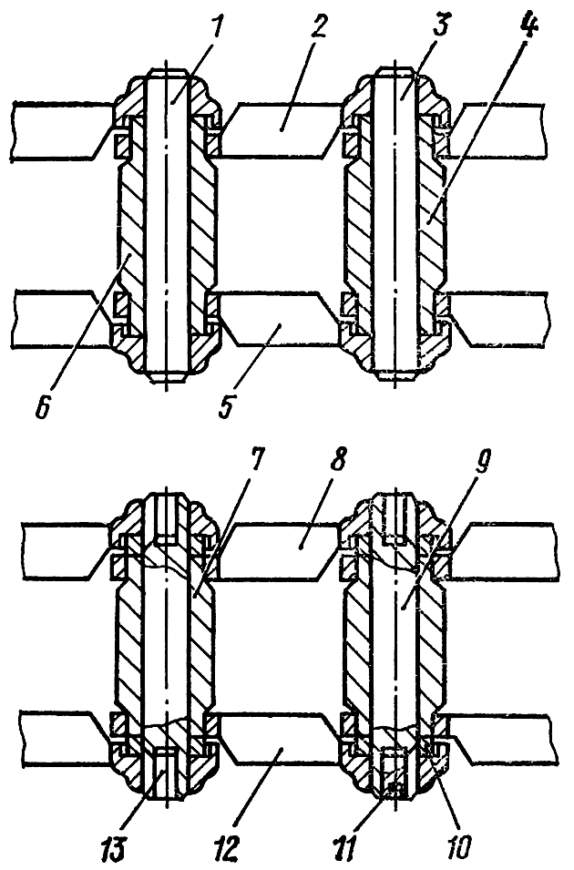 • установите новые звенья 8 и 12 с втулкой 7 в гусеницу вместо удаленных, предварительно заложив в гнезда звеньев новые шайбы 10;
