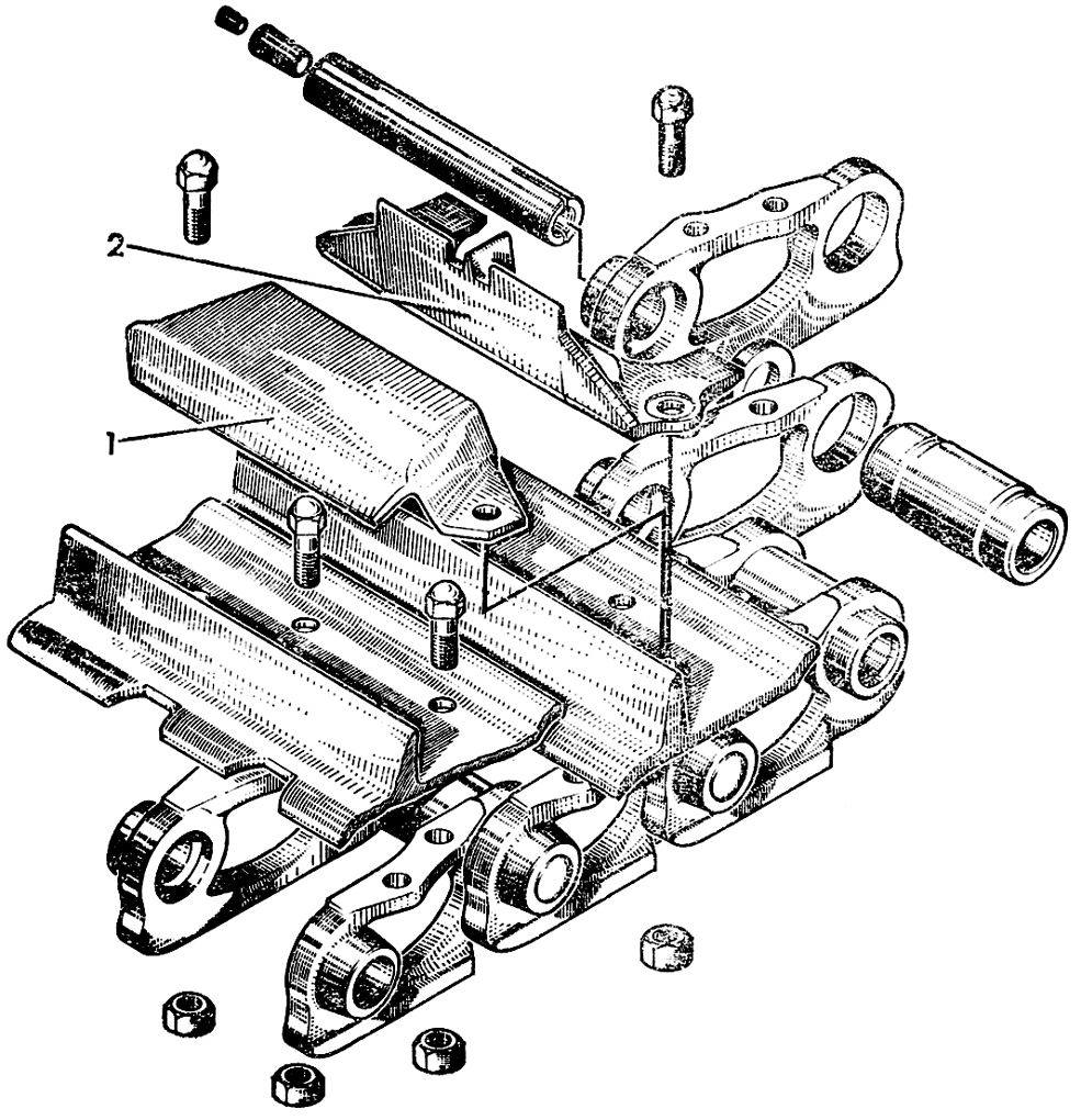Не разбирайте гусеницы вручную, так как при выбивании пальцев кувалдой неизбежно их повреждение. Перепрессовывайте втулки, пальцы гусеницы только в мастерской, где есть гидравлический пресс с усилием не менее 500 кН (50 тс). Уложите гусеницу башмаками вверх. Отверните болты с гайками и снимите башмаки гусеницы.