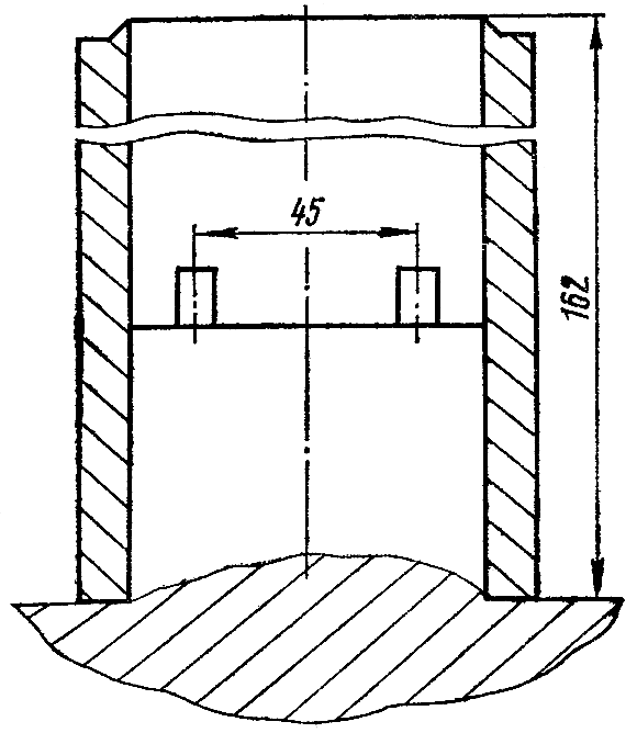 Наденьте на собранный поршень приспособление ( рис. 298 ), представляющее собой цилиндр с внутренним диаметром 70 мм. Затяните гайку 2 ( см. рис. 297 ). Момент затяжки гайки 200... 300 Н-м (20...30 кгс м). Гайку зашплинтуйте шплинтом 1. Поставьте поршень с приспособлением на цилиндр 9 ( см. рис. 296 ) и протолкните поршень в цилиндр. Вставьте шток 7 в цилиндр. Установите сальник 5 с крышкой 6 на цилиндр и закрепите болтами 10. Законтрите болты отгибными шайбами. Заверните пробку 2 с прокладкой 1 и клапан 3 пробкой 4. Заправьте шприцом в полость цилиндра 0,15 кг солидола и спрессуйте усилием на штоке 200 кН (20000 кгс). Утечка смазки не допускается. После опрессовки смазку удалите, вывернув пробку 2 из цилиндра.