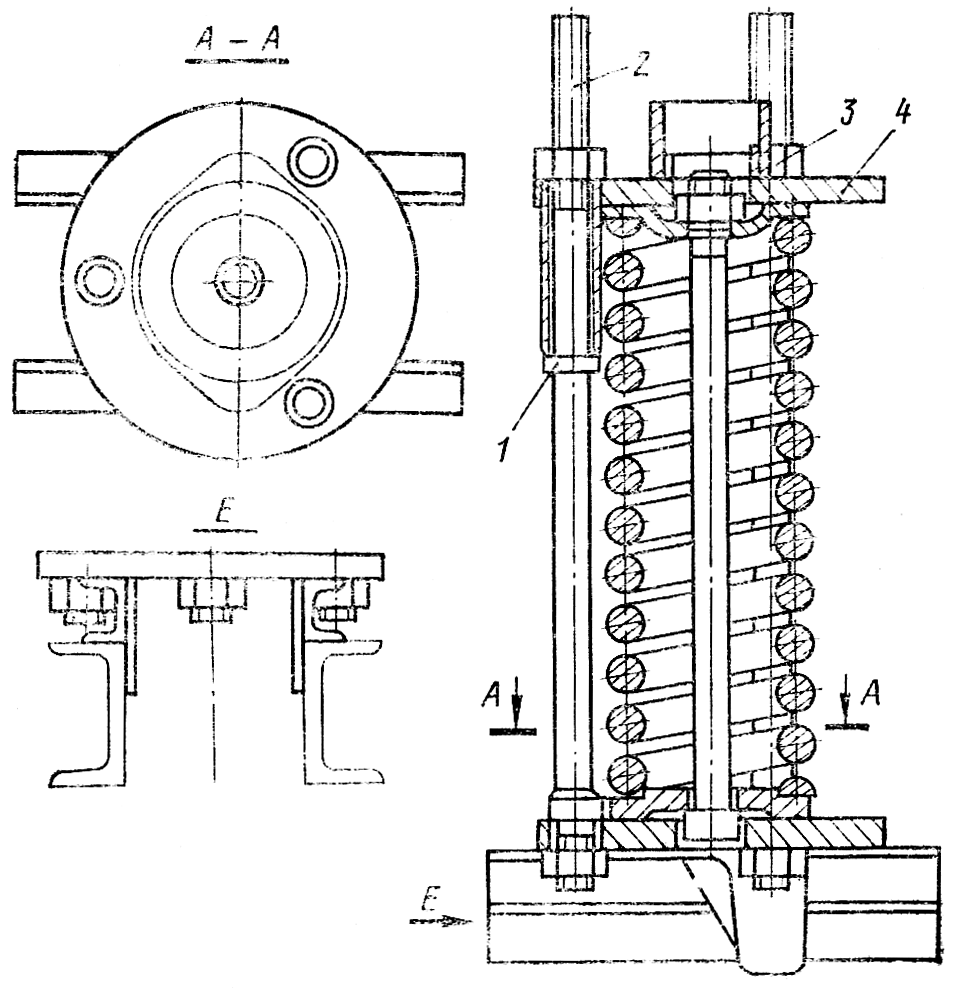 Установите механизм сдавания в приспособление ( рис. 300 ). Установите нажимную шайбу 4 на штанги 2 и наверните гайки 3. "Установите приспособление с механизмом сдавания на пресс. Сожмите пружину до отхода прокладки 1 ( см. рис. 299 ) от гайки 4. Затяните гайки штанг приспособления и отведите шток пресса. Отверните гайку 4 со стяжного стержня. Вторично сожмите пружину. Освободите пружину, последовательно отвертывая гайки штанг и отводя шток пресса. Снимите приспособление с пресса, фланец 5, пружину 6, и фланец 7 со стержня 3.