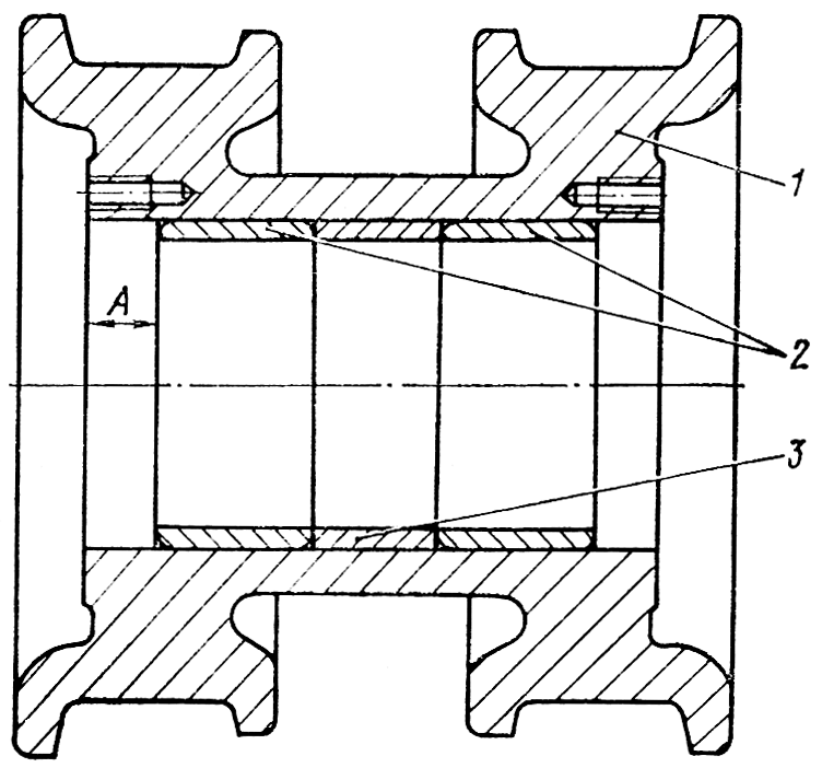 Протрите и смажьте маслом посадочное отверстие в ролике 1 ( см. рис. 283 ). Запрессуйте в ролик с помощью оправки и пресса наружное кольцо роликоподшипника 2 маркировкой наружу, обеспечивая размер А = (24±0,5) мм от торца ролика до торца кольца. Переверните ролик другой стороной кверху, установите дистанционную втулку 3 и запрессуйте второе наружное кольцо подшипника. Нагрейте в масляной ванне до температуры 363...373 К (90...100ºC) внутренние кольца 2 ( см. рис. 281 ) подшипников и напрессуйте их на ось 1 до упора в бурт маркировкой наружу. Разгрузочные кольца выполняют свое назначение только при установке их со стороны маркировки. Допускается местный зазор между буртом и торцом кольца не более 0,17 мм.