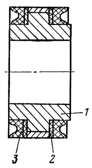 Наложите на сферу 1 ( см. рис. 321 ) два сухаря 26 и, совместив шпоночные пазы цапфы штока и сухарей, вставьте сферу с сухарями в цапфу. Установите две шпонки 14. Сухари устанавливайте с одинаковыми номерами цифровых клейм. Наложите крышку 30 и, совмещая отверстия крышки и цапфы, вставьте три болта с пружинными шайбами. Наденьте на болты вторую крышку и закрепите ее болтами с гайками 2 и пружинными шайбами. Наденьте на резьбовой конец штока 3 конусную оправку. Напрессуйте на шток собранную крышку 4 скребком к цапфе. Снимите конусную оправку. Наденьте на шток втулку 7. Совместите отверстия штока и втулки, вставьте в отверстие палец 5. Установите в канавку втулки пружинное кольцо 8. Наденьте на поршень 1 ( см. рис. 322 ) защитные кольца 2 до упора в торец. Установите на поршень две манжеты 3 до упора в защитные кольца. Наденьте на шток упор 18 ( см. рис. 321 ). Установите в канавку штока уплотнительное кольцо 19. Наденьте на шток поршень 9 с манжетами и установите второй упор 18. Закрепите поршень' на штоке гайкой 12. Момент затяжки гайки 1200...1500 Н-м (120...150 кгс-м).
