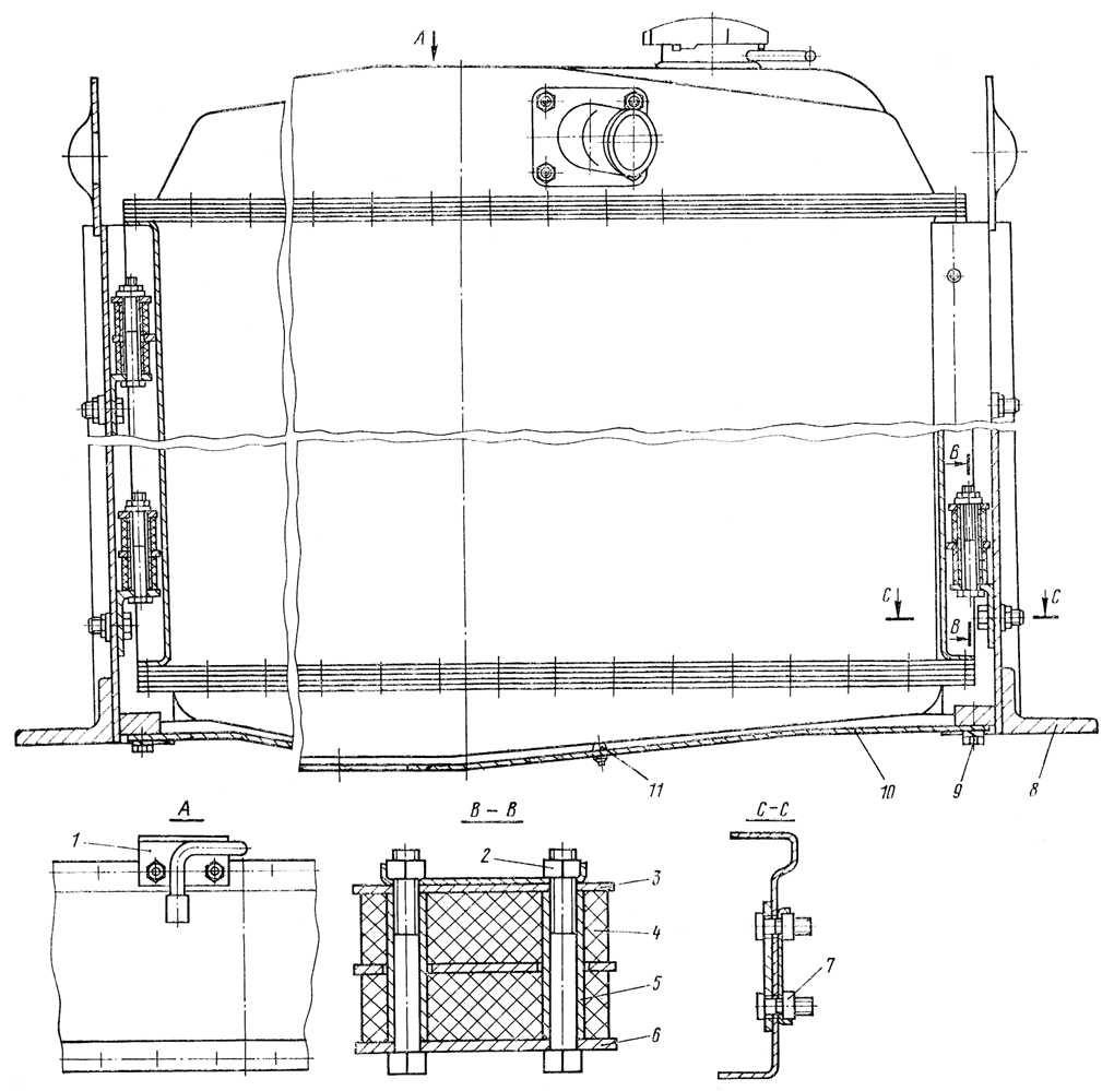 Установите восемь амортизаторов 4 ( см. рис. 314) в сборе со втулками 5 в отверстия четырех перегородок стоек радиатора. Вставьте болты уголков 6 во втулки амортизаторов, установите пластины 3 и закрепите их гайками 2 со стопорными пластинами.