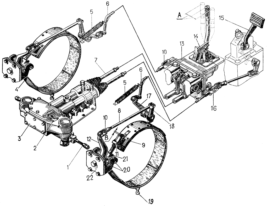 Снимите задний щиток, крышки верхних люков корпуса бортовых фрикционов и ослабьте болты 19, ввернутые в днище корпуса.