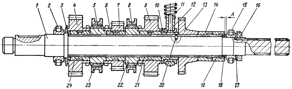 Установите на вал втулку 24, шестерню 4 заднего хода, муфту 5, муфту 23, втулку 6, шестерню 7 нормального диапазона, муфту 22, муфту 8, втулку 21, шестерню 9 ускоренной передачи, втулку 10.