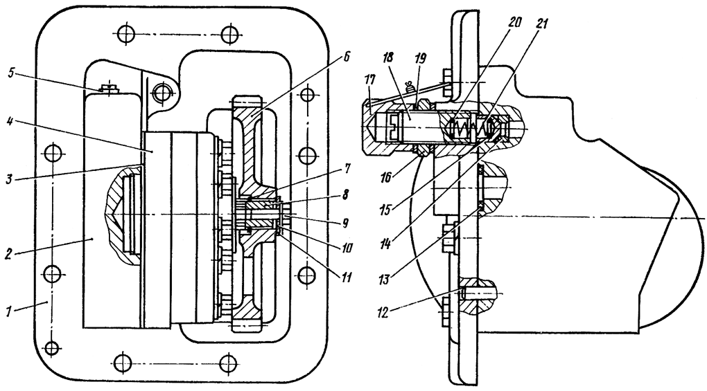 Закрепите фланец болтами с медными шайбами. Установите в отверстие корпуса 2 клапан 15. Установите последовательно шайбу, пружину 21, шайбу 20. Вверните в отверстие фланца стержень 18 с гайкой 16 и прокладками 19. Вверните пробку 5.